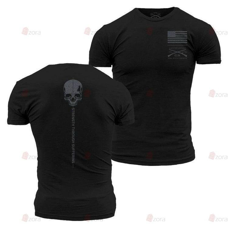 The front displays a patriotic flag patch and “Grunt Style” logo, while the back features a vertical skull design that demands attention. Ideal for training, military-style workouts, or street-style statements.